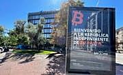 Cartel publicitario de Bit2me en la fachada de un edificio en Madrid. r. c.