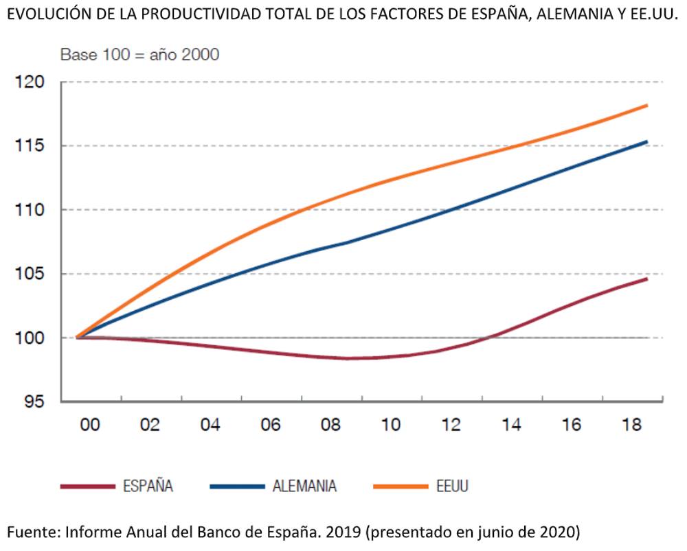 Por ello, pudiera parecer que el plan es fruto de la suma de planes ya existentes pero que requeriría de una visión más estratégica e integradora, cuyo objetivo debiera ser aumentar la capacidad de crecimiento a largo plazo de la economía española, cuya evolución ha sido decepcionante en estos últimos veinte años cuando se analiza la evolución del indicador básico que mide la capacidad de crecimiento a largo: la productividad total de los factores productivos de una economía.