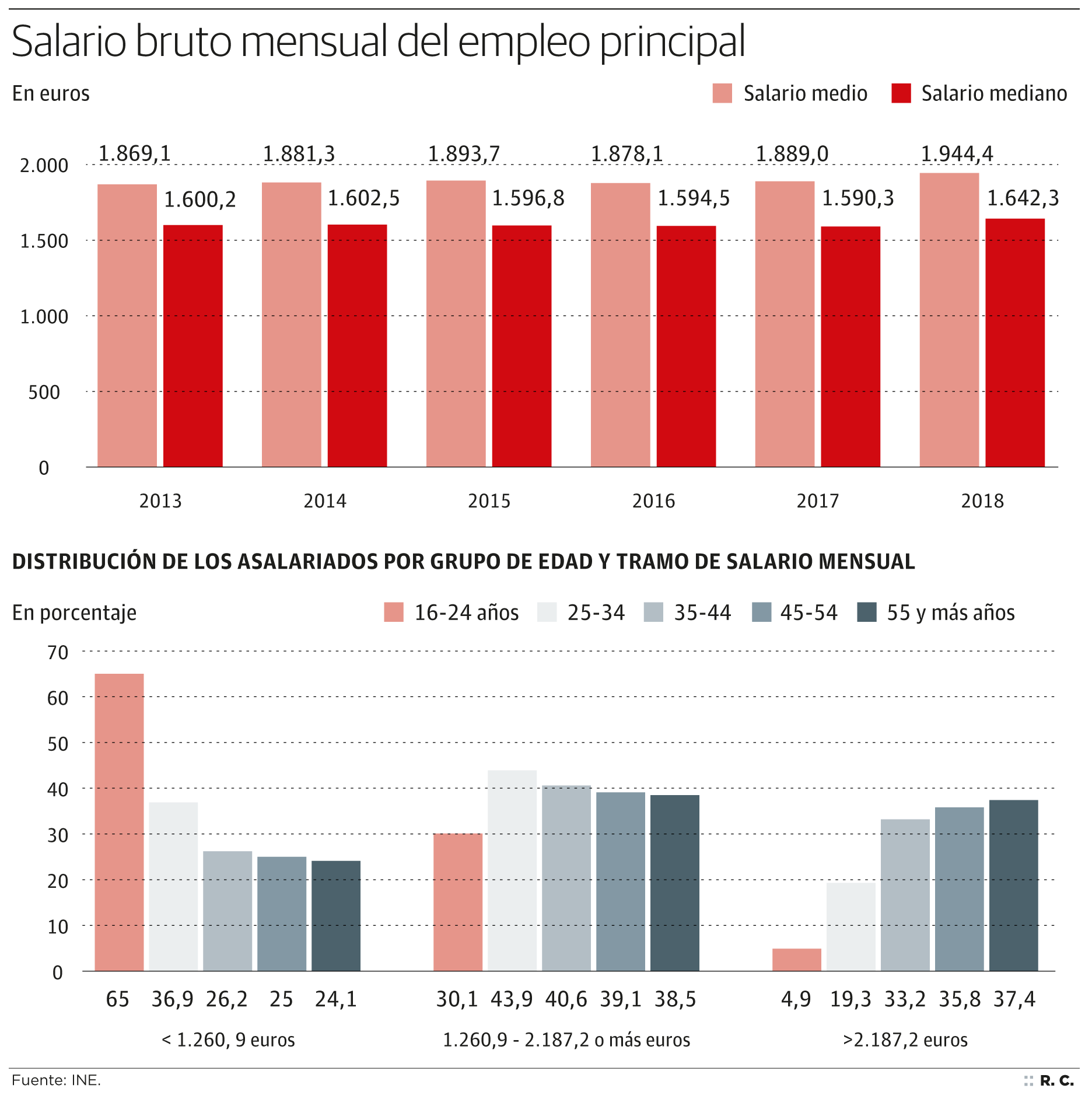 Respecto al salario mediano, es decir, el más común entre los españoles, se situó en 2018 en 1.642,3 euros al mes, lo que supone un aumento de 52 euros (2,9%) respecto al año anterior y significa 19.700 euros brutos al año. Y es que hay mucha diferencia entre unos salarios y otros. El INE apunta que el 30% de trabajadores (4,8 millones de personas) cobra menos de 1.261 euros brutos al mes, el 40% de los asalariados (6,4 millones) ganó entre 1.261 y 2.187 euros y el 30% restante obtuvo un sueldo superior a los 2.187 euros.