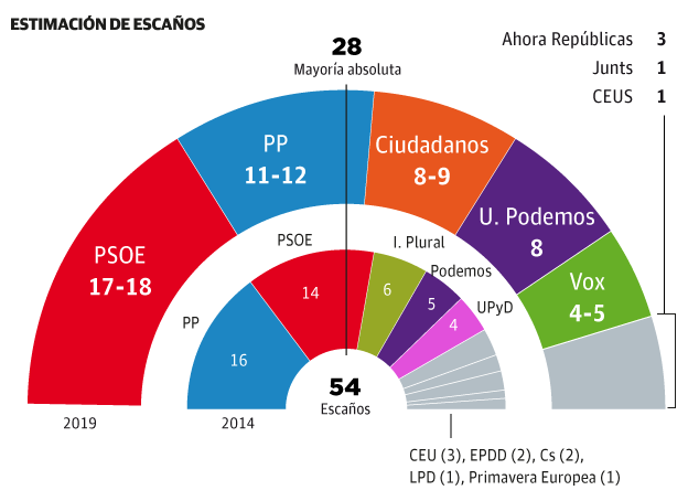 El Partido Socialista ganaría las elecciones europeas del próximo 26 de mayo con 17 o 18 diputados, el Partido Popular resistiría en la segunda ... posición, con once o doce escaños, y Ciudadanos no lograría el 'sorpasso' y tendrá que conformarse con ocho o nueve europarlamentarios, según el Barómetro Preelectoral de Abril del Centro de Investigaciones Sociológicas (CIS). En la actualidad, los populares son el partido con más representantes, 16; los socialistas tienen 14; Unidas Podemos, cinco; y Ciudadanos, dos.
