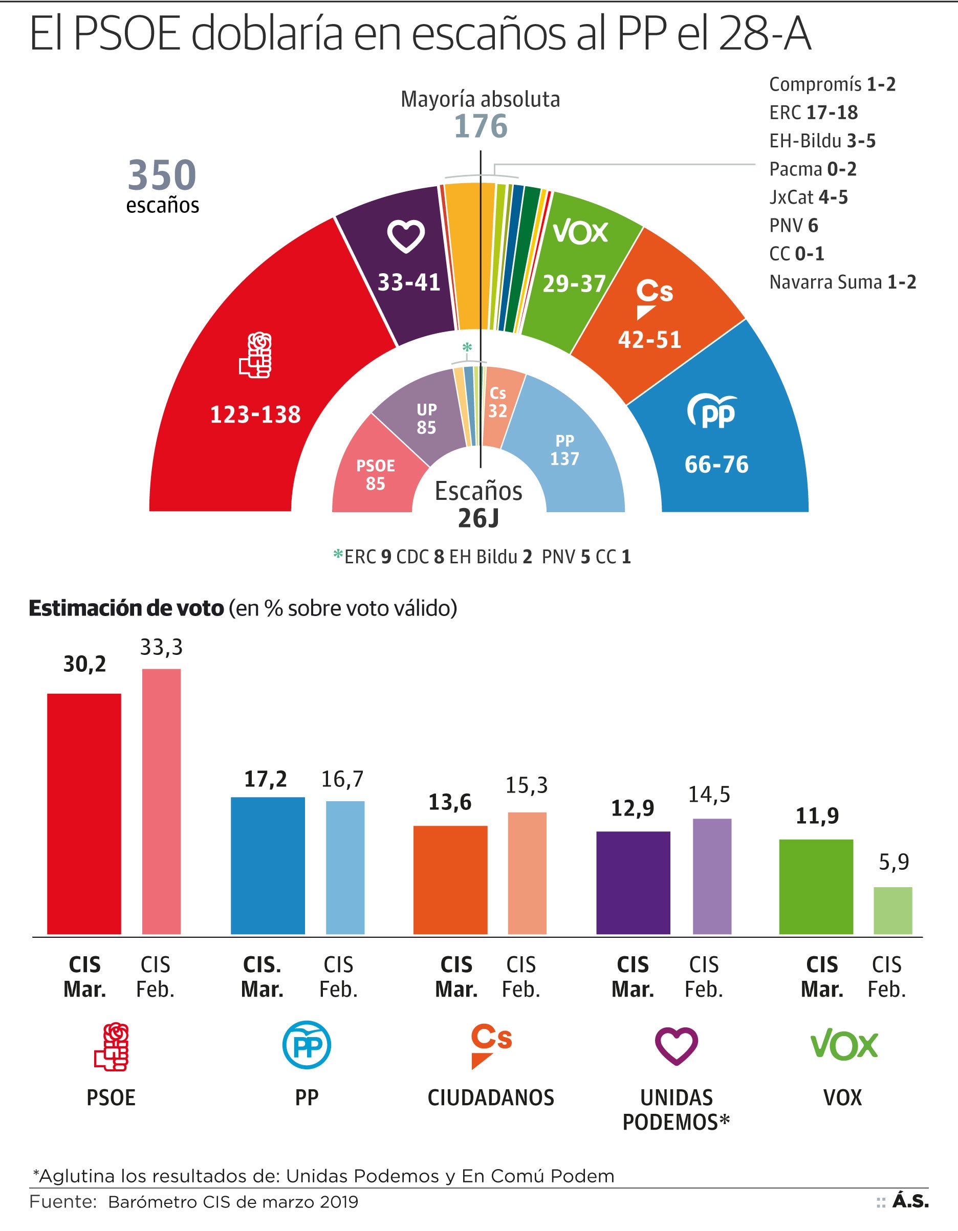 El PSOE ganaría y duplicaría los escaños del PP el 28 de abril. El amplio sondeo preelectoral del CIS señala que los socialistas ... obtendrían entre 123 y 138 diputados, y los populares se quedarían entre 66 y 76. Ciudadanos se consolidaría como tercera fuerza con entre 42 y 51 representantes en el Congreso, mientras que Unidas Podemos y Vox pelearían por la cuarta posición. Los morados sumarían de 33 a 41 escaños con la aportación de En Comú Podem mientras que la extrema derecha cosecharía de 29 a 37.