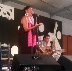 Cuando apenas han transcurrido unos segundos, tiempo que se tarda en adaptar las luces para la nueva puesta en escena, la voz de la malagueña Lidia Gómez interpreta De Andalucía yo soy. Lleva un vestido rojo con pedrería en plata. Su silueta recorre todo el escenario. Tras esa primara canción, bebe un poco de agua y saluda al público. Es un placer estar aquí para todos ustedes, espero estar a la altura de mis compañeros. Presenta la siguiente canción, el pasodoble Elvira la cantaora, al que dedica toda su fuerza y expresividad. Y como lo más importante al cantar es transmitir, qué mejor elección que una canción malagueña en su totalidad, que narra la historia de una niña en un parque, La niña de puerta oscura.