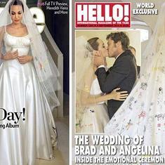 Casi dos semanas después se han publicado en algunas revistas estadounidenses las fotografías de la boda y gracias a estas se ha podido ver a Angelina Jolie vestida de novia. Angelina Jolie escogió para su gran día un diseño muy original de Luiggi Massi, del Atelier Versace. Blanco, de estilo clásico y con velo, pero con estampados en colores de dibujos hechos por los hijos de la pareja, que participaron muy activamente durante toda la ceremonia.