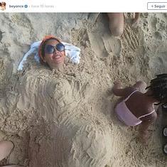 El pasado domingo 11 de enero Beyoncé compartió en Instagram una foto en la que aparece enterrada en la arena y con una panza de mujer embarazada moldeada encima de ella, mientras Blue Ivy juega a los pies de su madre.