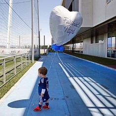 "Felicidades papá", decía un gran globo con forma de corazón que el pequeño Martín sostenía con su manita, mientras miraba al campo de entrenamiento.