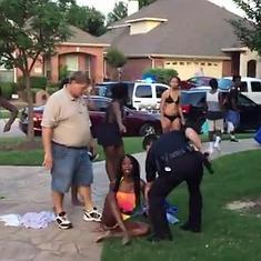 En una caótica escena en la que se puede ver a adolescentes corriendo en la zona de la piscina para evadir a la Policía, un oficial tira a una chica negra al suelo y la sujeta, desenfundando luego su arma cuando dos jóvenes negros se aproximan, aparentemente para interceder por ella.