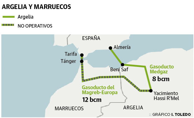 No obstante, la ruptura de relaciones diplomáticas entre Argelia y Marruecos por la cuestión del Sáhara, que el año pasado provocó el cierre del gasoducto Magreb-Europa (con capacidad para enviar 12 bcm a través de territorio marroquí), se ha convertido en un quebradero de cabeza para España, enfrentada con un difícil dilema: reconocer la postura de Rabat -y de Estados Unidos- y airar a Argel, lo cual también supone dar carpetazo a la histórica demanda de un reférendum de autodeterminación para el pueblo saharaui, o mantener la política anterior sobre la excolonia y aventurarse a represalias marroquíes en forma de ola migratoria. El Ejecutivo de Pedro Sánchez optó por la primera opción y estuvo a punto de provocar el cierre de la segunda conexión con Argelia, el Medgaz, que tiene una capacidad de 8 bcm y discurre bajo el Mediterráneo directamente entre ambos países.