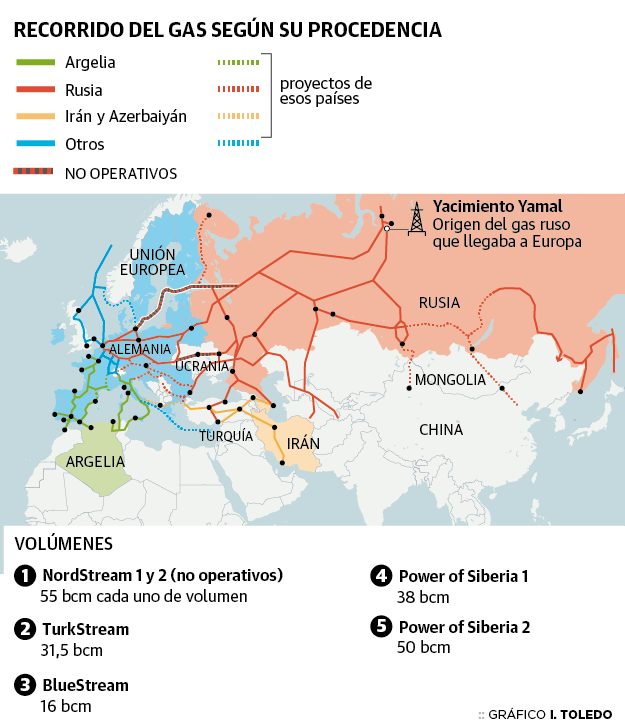 Muchos ven este giro como una confirmación más de que el orden mundial ha cambiado para girar hacia Oriente. No obstante, China es reticente a dar un apoyo claro a Putin y mantiene una incómoda equidistancia, similar a la de Turquía, que es aliada de Putin y destino de los gasoductos Blue Stream y TurkStream -que discurren por el Mar Negro con capacidad para 47,5 bcm-, pero también miembro de la OTAN y suministrador de drones muy efectivos al ejército ucraniano. Mientras tanto, India es la que más ha incrementado sus compras de gas sin miramientos, como si el conflicto no tuviese nada que ver con ella.