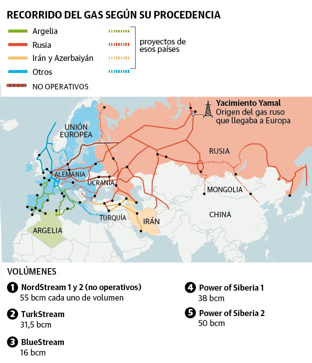 Rusia esconde casi una cuarta parte de todas las reservas de gas natural de la Tierra. Unos 37,4 billones de metros cúbicos. La mayor parte, sobre todo el que fluía hacia Europa a través de los dos gasoductos Nordstream, se concentra en los yacimientos de Yamal, en la parte occidental de Siberia. Pero también cuenta con importantes reservas en el Mar Caspio y en el centro del país, por donde discurre el Power of Siberia, la fina arteria que conecta Rusia y China.