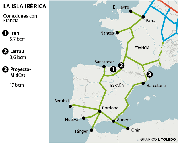 Puede que España y Portugal dibujen una península en el mapa de Europa, pero en términos energéticos son una isla. Porque los dos gasoductos que la unen a Francia a través de territorio vasco y navarro son minúsculos, permiten enviar únicamente 8,7 bcm al año -5,3 por Irún y 3,6 por Larrau-, e impiden desarrollar el potencial de España como suministrador alternativo de gas a Europa.