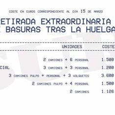 En total, los once días de huelga han supuesto un gasto cercano al medio millón de euros. A partir de ahí, el resto del coste lo asume Limasa con parte del dinero descontado al personal fijo por secundar el paro. Para cuadrar la cifra habrá que esperar a que concluyan los trabajos, ya que cada día va cambiando el número de camiones externos contratados. Pero las tarifas de cada compañía permiten hacerse una idea. Un camión de FCC con conductor y dos operarios cuesta 86,4 euros la hora durante el día y 97,5 por la noche (IVA excluido); mientras que uno del Consorcio con un conductor se paga a 37,7 euros la hora más 1,7 euros por kilómetro. La hora de trabajo en Tragsa es de 45 euros por vehículo y unos 15 horas por empleado;y las empresas locales contratadas cobran entre 1.126y 1.500 euros por dos vehículos y su personal.
