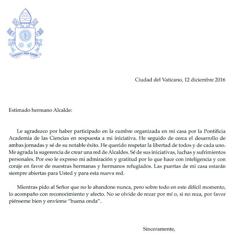 El Papa Francisco le agradece al primer edil su idea de crear una red de alcaldes para abordar el asunto de los refugiados, y le comenta que sabe de «su notable éxito» porque ha hecho seguimiento de las jornadas. Resulta curiosa la siguiente frase:«Sé de sus iniciativas, luchas y sufrimientos personales» al tiempo que también le expresa su gratitud por el acogimiento de refugiados y le dice que su casa siempre estará abierta para él y para la futura red de alcaldes.