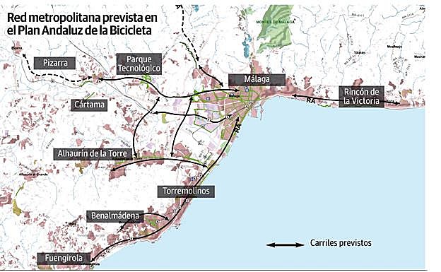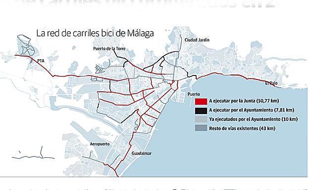 El Plan Andaluz de la Bicicleta, gestado por la Junta en 2013 cuando la Consejería de Fomento estaba en manos de IU ( ... en enero de 2015 volvió al PSOE tras la ruptura del pacto de gobierno), ha pasado por méritos propios a engrosar la lista de proyectos pendientes por parte de la Administración autonómico. Un pinchazo absoluto, especialmente en Málaga, toda vez que es la única provincia en la que el Ejecutivo regional aún no ha hecho ninguno de los trazados previstos en esta ambiciosa apuesta que consistía en completar la red de carriles bici de la capital antes de que acabase este año y en conectar todo el área metropolitana en 2020. Ni una ni otra. Casi cuatro años después de que el Consejo de Gobierno le diera luz verde (enero de 2014) ni se han dado pasos para esa malla interurbana de 114,73 kilómetros que enlazaría todo el litoral desde Fuengirola hasta Rincón de la Victoria con el Valle del Guadalhorce ni existe ninguno de los 50,77 kilómetros que le corresponde acometer en la ciudad de Málaga en virtud del convenio suscrito con el Ayuntamiento para repartirse un total de 68,58 kilómetros (los 17,81 restantes los asume la Administración municipal, que también debe poner los terrenos a disposición y hacerse cargo del posterior mantenimiento). Donde sí que están cumpliendo con su parte es en el Consistorio al tener operativos 10 de los 17,8 kilómetros que le competen, a los que hay que sumar el trazado de 1.172 metros que está construyendo en Bailén-Miraflores para enlazar Arroyo de los Ángeles con Nuestra Señora de Clarines y Martínez de la Rosa.