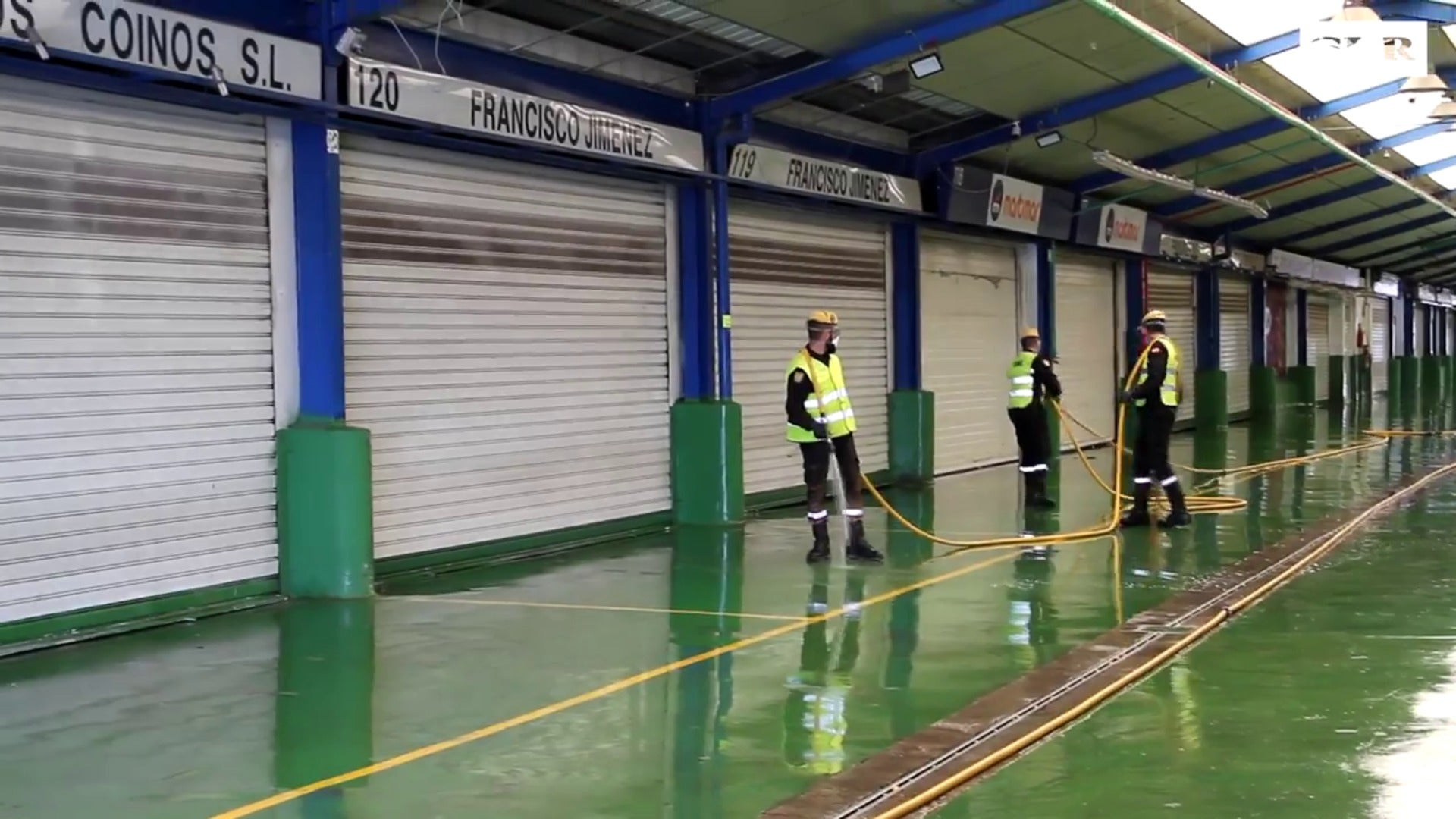 Efectivos de la UME y Bomberos de Málaga desinfectan Mercamálaga