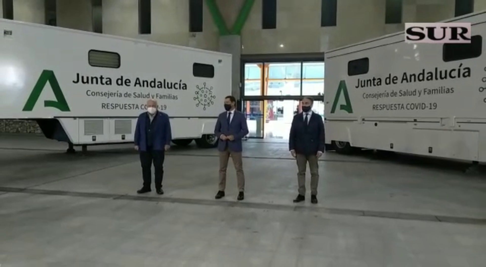 Juanma Moreno presenta los camiones que recorrerán Andalucía con equipos móviles para hacer pruebas del covid