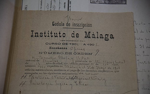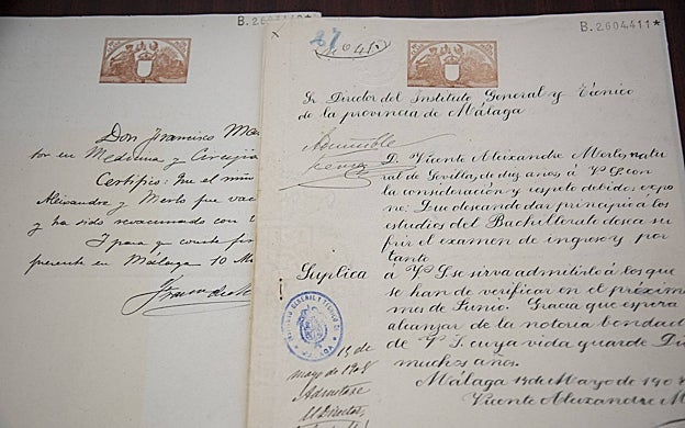 FRANCIS SILVA Vicente Aleixandre residió en Málaga entre los dos y los diez años. El archivo conserva los certificados de nacimiento, vecindad y vacunación, necesarios para realizar el examen de ingreso. Pero, como en el caso de Picasso, su estancia en el instituto fue breve, pues su familia se trasladó a Madrid.
