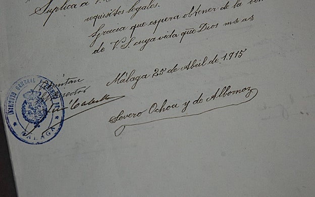 FRANCIS SILVA Una de las carpetas más voluminosas de las que enseña el director del instituto Martiricos, Diego Palacios, corresponde al Premio Nobel Severo Ochoa. Son muy abundantes los documentos, desde el examen de acceso, las instancias con sus correspondientes timbres, los títulos e incluso el telegrama de agradecimiento cuando consiguió el Nobel. Estudió en el Gaona entre 1915 y 1921. Y atribuyó a sus profesores su interés por las ciencias naturales. «Mi afición por la Bioquímica nació entonces», escribió en 1930. Cuando recibió el Nobel del Medicina en 1930 dirigió un emotivo telegrama al instituto, reiterando su gratitud hacia sus antiguos profesores. Pocos meses antes de su muerte había vuelto a visitar el centro.