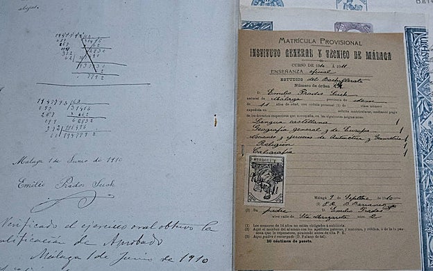FRANCIS SILVA Emilio Prados hizo su examen de ingreso en junio de 1910, cuando tenía 11 años. La prueba consistía en un dictado (habitualmente, un pasaje de 'El Quijote') y una operación matemática. El que fuera después una destacada figura entre los poetas de la Generación del 27 se dio cuenta del fallo y pudo rectificar la división. A la derecha, matrícula en las asignaturas de Lengua castellana, Geografía general y de Europa, Religión y Caligrafía.