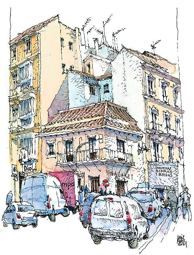 El cambio a verde del semáforo de calle Ollerías desencadena un torrente de vehículos que trepa en dirección a Álamos; mientras, la hilera de coches ... que repta sobre el asfalto de Carretería se detiene ante el bar Jamón, a la espera de su turno para hacer lo propio. El espectáculo dista de ser edificante y, sin embargo, la turbamulta de motos y furgonetas de reparto compone una improvisada coreografía que ejerce un efecto hipnótico en quien la contempla. El acelerón con el que los conductores encaran ese último repecho resulta, eso sí, estéril, por cuanto el cuello de botella que les aguarda unos metros más arriba les detendrá sin remedio, una vez más. Allí, en la esquina, la pequeña edificación que cierra la manzana proporciona el decorado a la escena y deja ver un entalle insólito en el que el sol estival se recrea con su juego de luces y sombras.