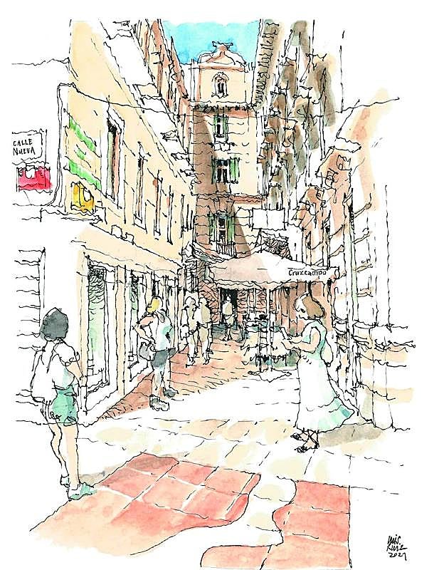La turista extranjera (¿francesa, quizá?) se detiene ante el rótulo de la calle, puede que al detectar un nombre que le resulta familiar. Tras un ... inicial gesto de extrañeza, entiende que el callejero local ha optado por la versión españolizada de Ferdinand de Lesseps, el diplomático y empresario que promovió la construcción del Canal de Suez. El dibujante aprovecha el momento de desconcierto de la visitante para plasmarla en su cuaderno, mientras se pregunta acerca del sentido del humor de quien bautizó un callejón sin salida en homenaje a quien conectó los mares Rojo y Mediterráneo. Por fin, nuestra protagonista reemprende la marcha, sin haber advertido el dibujo en el pavimento sobre el cual ha estado detenida: un cuadrado de mármol rojizo atravesado por un canal ondulante; sutil alusión simbólica a Fernando de Lesseps por parte de Eduardo Serrano, el arquitecto que reformó la vía en los años 90.