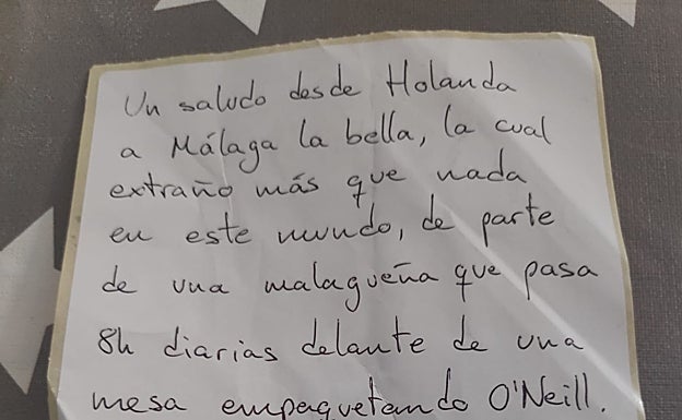 La pareja relata que hizo un pedido de varias camisetas a través de la pagina web oficial de O'Neill, una conocida marca de ropa relacionada con el mundo del surf. «Cuando llegó el paquete, junto con las camisetas apareció la nota escrita a mano, pero no tenemos ningún contacto, sólo sabemos lo que dice la nota: que añora mucho Málaga».