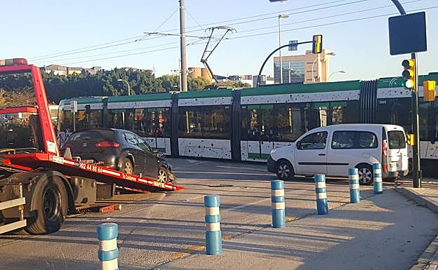 Nuevo accidente entre un coche y el metro de Málaga en el cruce del Clínico con dos heridos leves