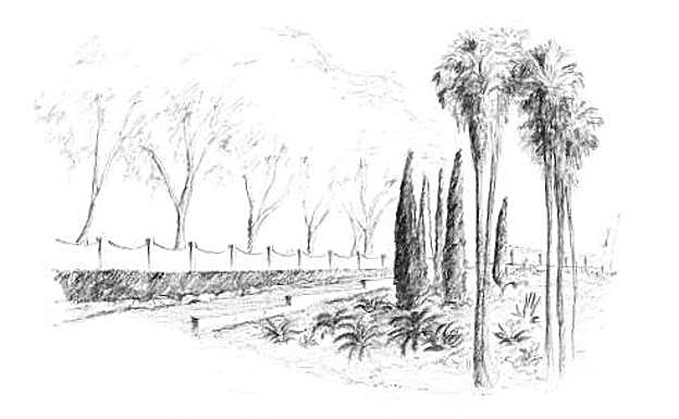 En el entorno del restaurante se restaurará el jardín histórico de estilo regionalista formado por la fuente (donde en algunos momentos manaba vino); los bancos y los azulejos. Así como la plantación de más palmeras y un jardín de boj a modo de zócalo de la tapia original (de la que una parte se conservará).