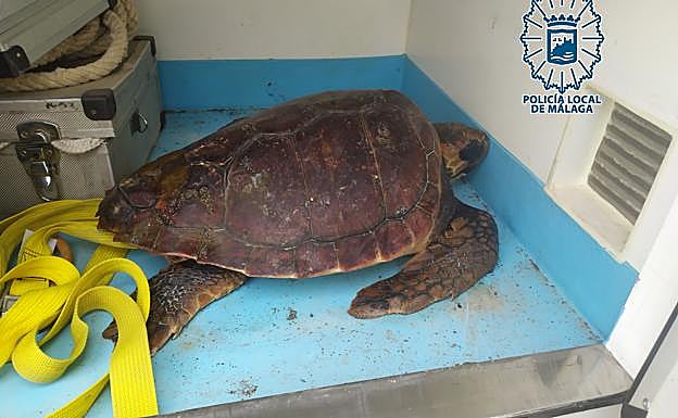 Recuperan un ejemplar de tortuga boba varado en una playa de la capital malagueña