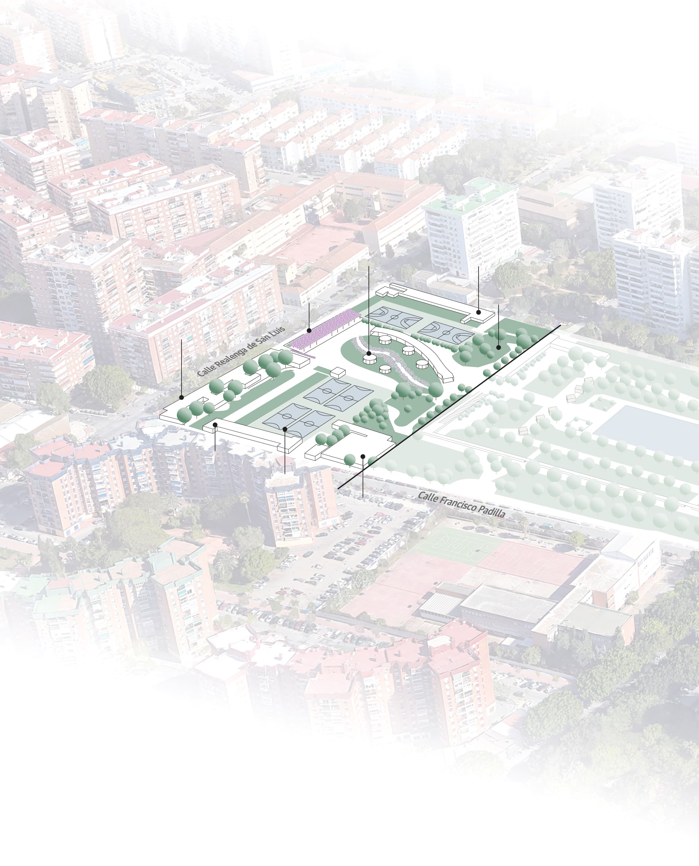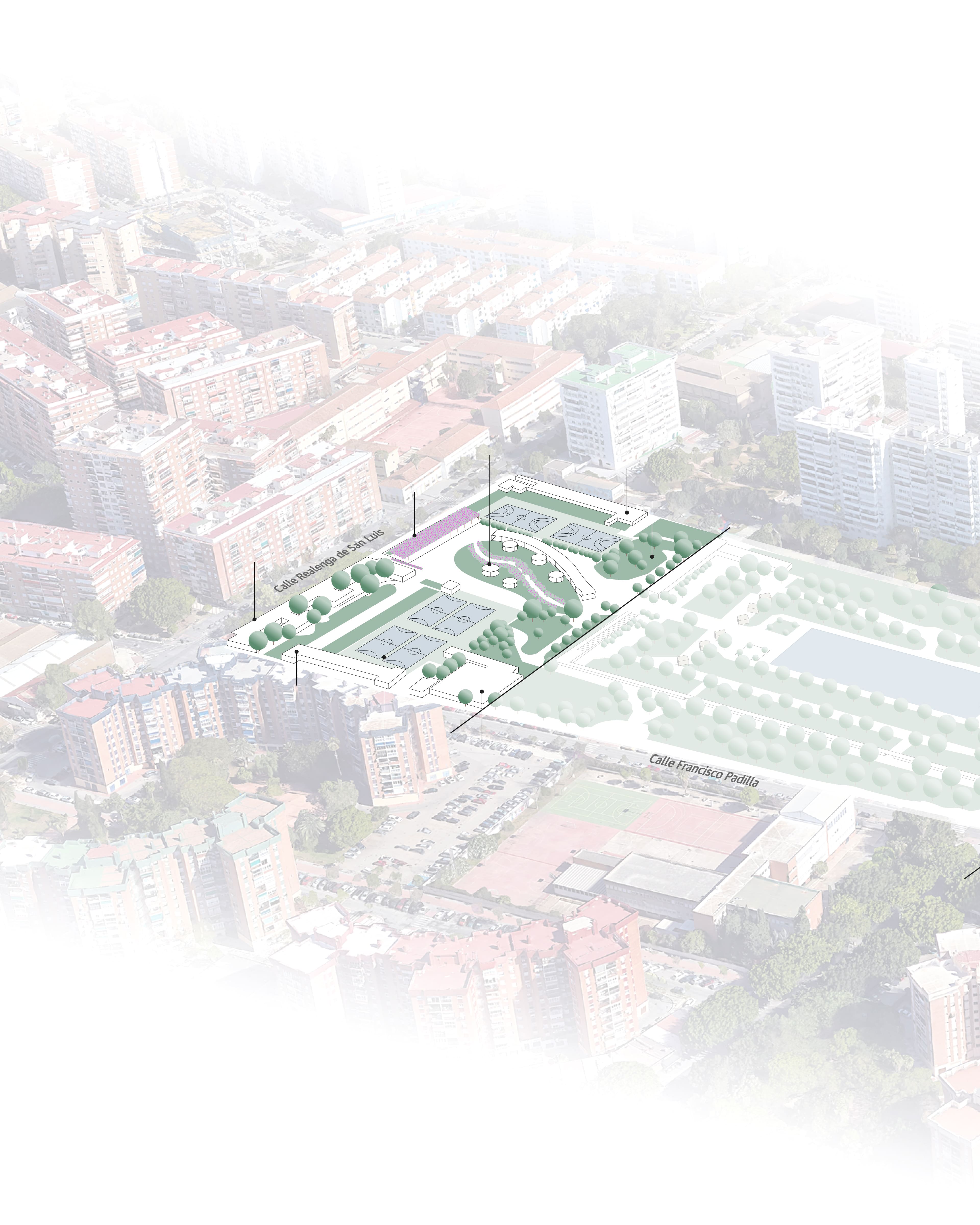Asimismo, se introduce una nueva pérgola con especies florales en la entrada por este flanco norte, y también se incorpora más vegetación en un espacio que separa las pistas deportivas.