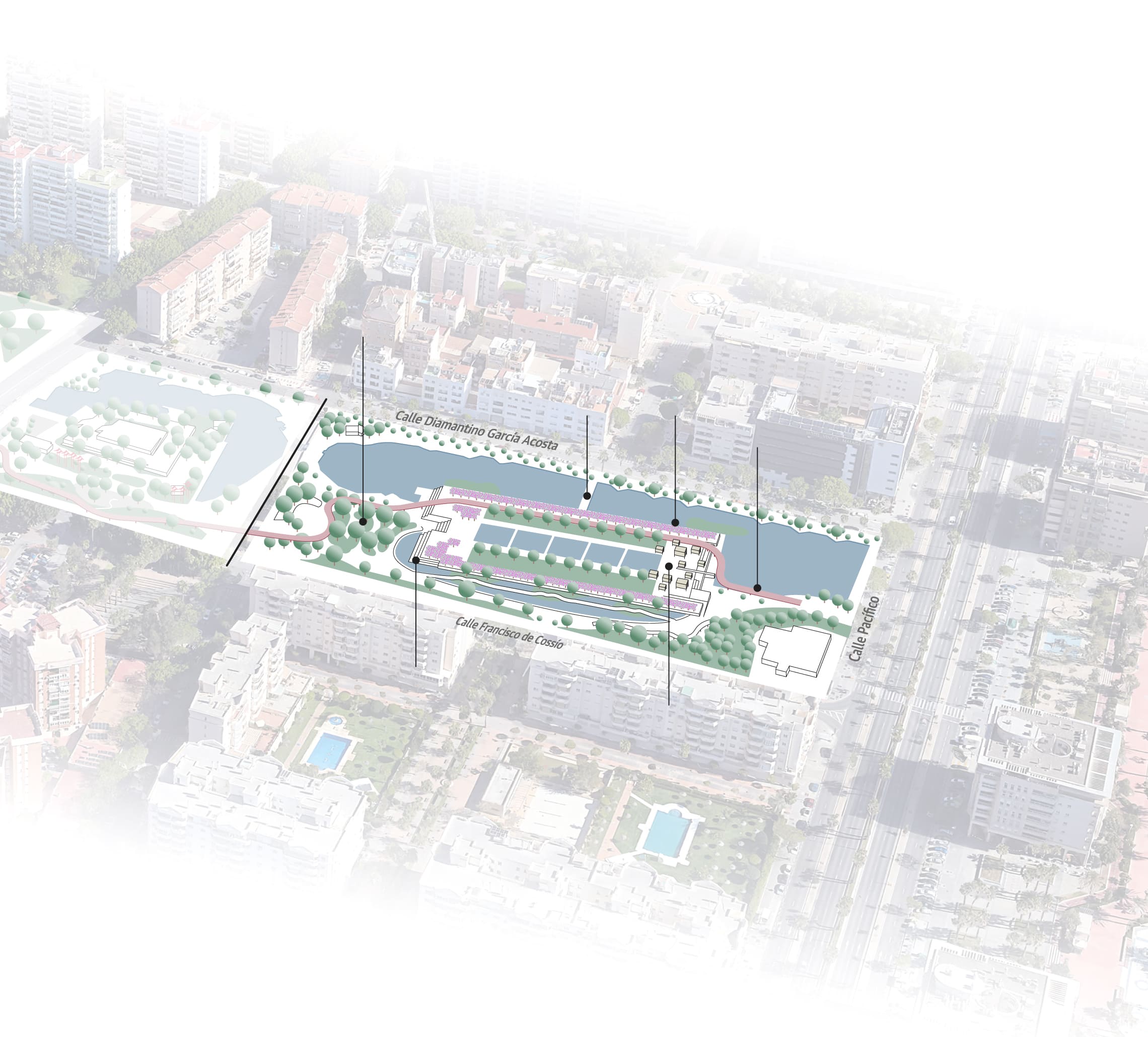 Para ello, se ocuparía parte de las pistas deportivas que existen en esta zona, que se remodelan y se mejoran con nuevos aseos y vestuarios. El actual edificio de vestuarios, que no se utiliza, se convierte en una zona de almacenes para el parque.