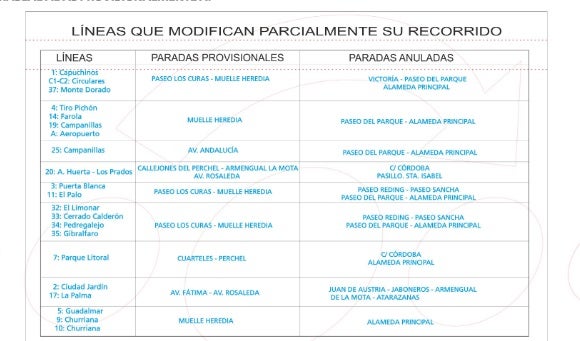 Debido al recorrido de la cabalgata, a partir de las 14:00 horas las paradas del lateral Norte del paseo del Parque se trasladarán al paseo de los Curas. Desde las 16:00 horas y durante el tiempo que la cabalgata discurra por el paseo del Parque, Alameda Principal, calle Atarazanas, pasillo de Santa Isabel, calle Carretería y plaza de la Merced se producirán las siguientes alteraciones en el itinerario y cabeceras de las líneas en el Centro Histórico. La línea 7 en sentido Miraflores, seguirá parando en Calle Hilera. Está previsto que las distintas líneas recuperen sus paradas habituales aproximadamente dos horas después de que haya pasado la cabalgata de Reyes.