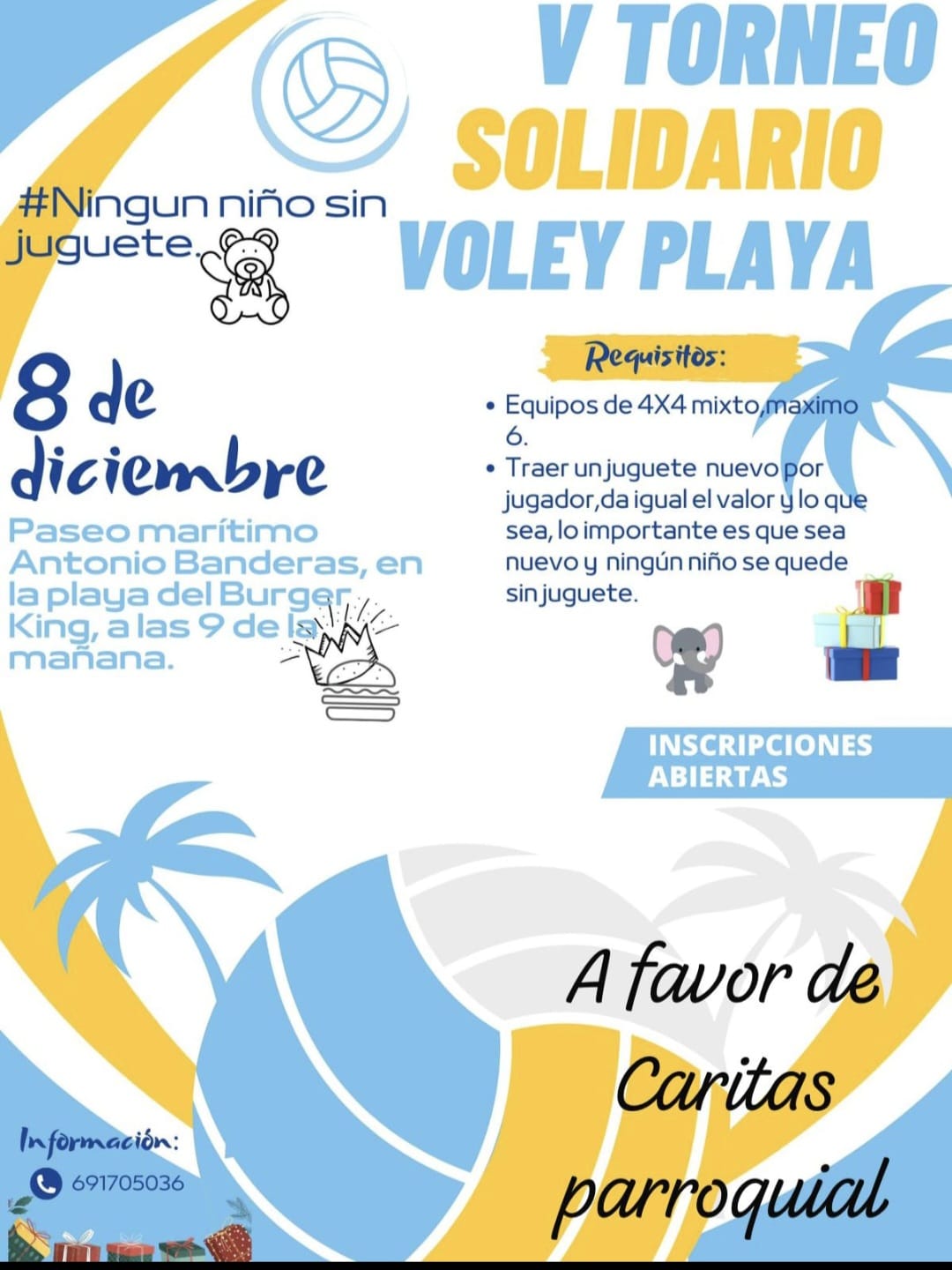 'Ningún niño sin juguete. Con ese ambicioso objetivo vuelve al barrio malagueño de Hulin el torneo solidario de voley-playa, que cumle su quinta ... edición. La cita será este domingo, 8 de de diciembre, en el Paseo Marítimo Antonio Banderas (a la altura del Burger King). Participarán equipos de 4x4 mixto (máximo seis miembros) y como requisito deben llevar un juguete nuevo por cada integrante.