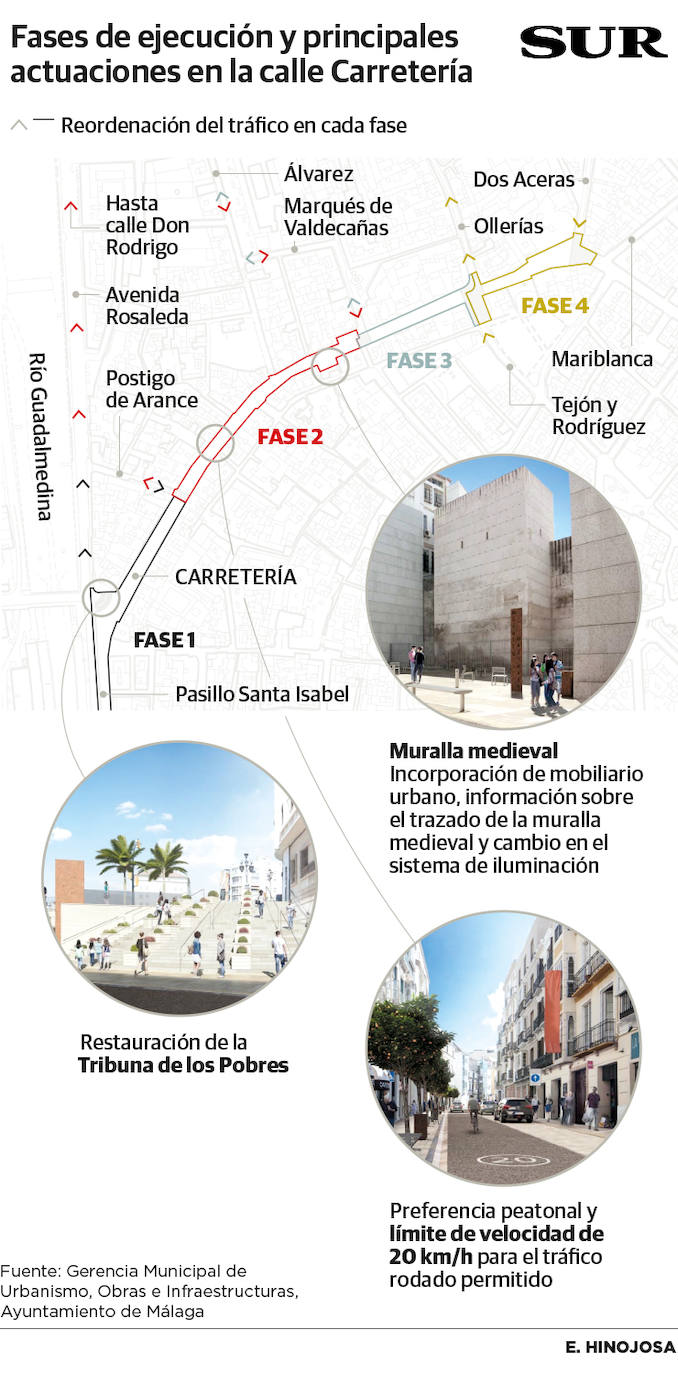 La obra de la calle Carretería se llevará a cabo en cuatro fases o etapas diferenciadas: una primera desde el pasillo de Santa Isabel hasta la calle Postigo de Arance, una segunda desde Postigo de Arance hasta la calle Marqués de Valdecañas, una tercera desde esta vía hasta el bordillo oeste de las calles Ollerías y Tejón y Rodríguez, y una cuarta desde este punto hasta la confluencia con la calle Álamos.