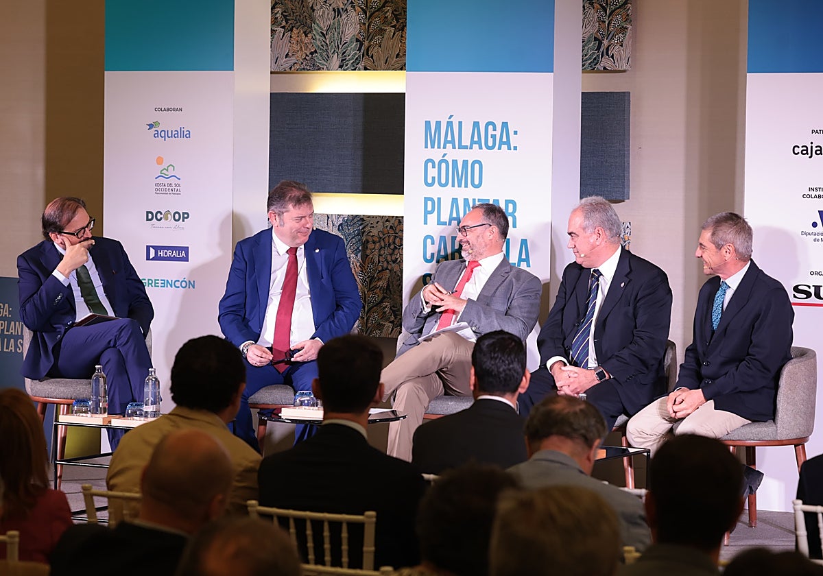En este panel han intervenido Manuel Jiménez, presidente del Colegio de Administradores de Fincas. Salvador Merino, vicerrector de Infraestructuras y Sostenibilidad de la Universidad de Málaga (UMA) y especialista en agua y energía; Julio Berbel, catedrático de la Universidad de Córdoba y miembro del comité de expertos de la sequía de la Junta de Andalucía; y Carlos Mínguez, socio de Andersen, experto en Derecho Público y Regulatorio. La mesa ha estado coordinada por el redactor de SUR Ignacio Lillo.