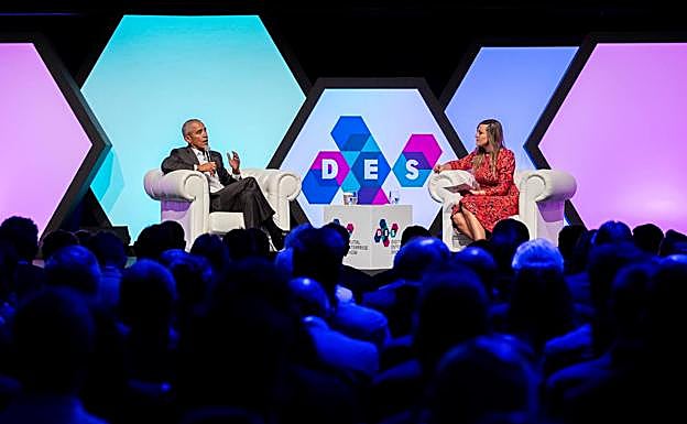 Sentado en un sofá chesterfield, vestido con un traje ligero oscuro y camisa blanca sin corbata, el premio Nobel de la Paz ha reflexionado sobre los grandes desafíos que afronta la humanidad: la guerra de Ucrania, la lucha entre autoritarismo y democracia, el cambio climático, la revolución digital, la desigualdad social y la falta de oportunidades para los jóvenes. No todo el diálogo ha sido serio: como buen 'speaker', Obama ha buscado la complicidad del público con chascarrillos sobre la cultura local («Me han dicho que en España no todo el mundo duerme siesta; no sé si será verdad») y pequeñas confesiones personales: «Michelle viene más que yo a España; viene a veces sin avisarme y se dedica a beber mucho vino y a tomar el sol».