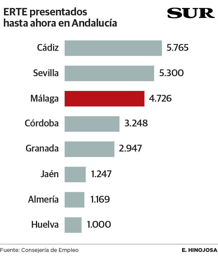 Les suelen tildar de agoreros, pero esta vez los sindicatos se han quedado cortos a la hora de calcular las dimensiones de la avalancha de ... despidos temporales. Ayer el Gobierno andaluz facilitó por fin los datos provinciales de expedientes de regulación temporal empleo (ERTE) presentados por empresas en la región desde que entró en vigor el estado de alarma. En Málaga eran 4.726 hasta las 14.00 de ayer, más del doble de los que CCOO estimaba.