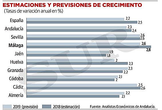 La economía malagueña, que cerró 2018 con el mayor aumento del PIB en Andalucía (2,8%), verá ralentizado su crecimiento pero seguirá a la cabeza ... de la Comunidad durante 2019 con una estimación del 2,6 por ciento frente al 2,3% para el conjunto de la región, una décima menos que el año anterior. La región crecerá a un ritmo más moderado que en el segundo semestre del pasado año al igual que la economía nacional. Sevilla, con igual previsión de registro que Málaga, y Cádiz, con el 2,5%, serán las otras provincias más dinámicas. Las previsiones de Analistas Económicos, que ayer presentó su informe de primavera, dibujan para 2019 un escenario de ralentización por segundo año en la dinámica de crecimiento continuado que arrancó en 2014.