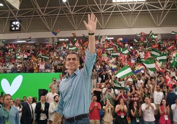 «Presidente, presidente», ha coreado el público en la subida al estrado de Pedro Sánchez, que ha vaticinado la victoria electoral de Montero en Andalucía. Ha empezado aplaudiendo las movilizaciones en torno a la Vuelta Ciclista a España y Palestina. El presidente, pantalones y camisa vaquera remangado, ha resaltado el ejemplo de España en la defensa de los derechos humanos: «Vivan los derechos humanos y viva el pueblo español».