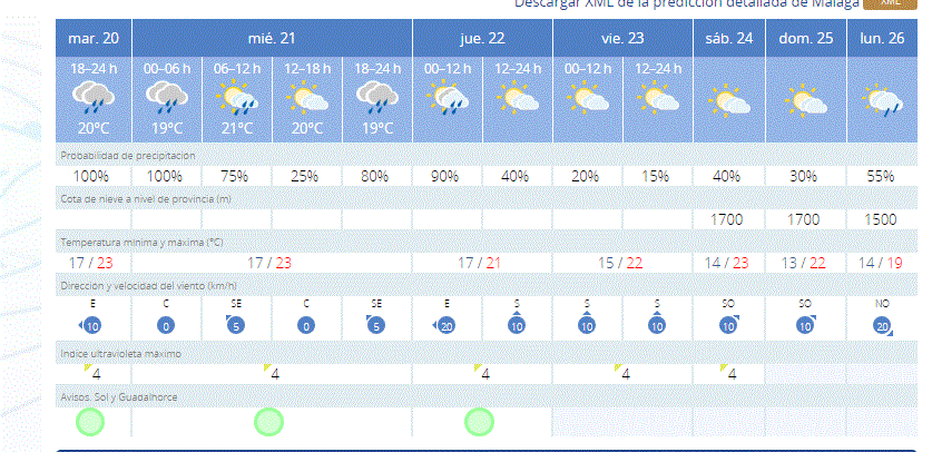 La probabilidad de agua hasta las 12 de la mañana es del 75%, porcentaje que se reducirá al 25% hasta las seis de la tarde, cuando volverá a subir hasta el 90% según la previsión. Además, los vientos soplarán variables flojos en el litoral oriental y del suroeste en el resto, y serán ocasionalmente fuertes con rachas muy fuertes en zonas altas. De hecho, la comarca de Ronda ha estado en aviso de nivel amarillo por fuertes vientos hasta las tres de esta madrugada, después de haberlo estado también durante buena parte de la tarde de ayer. En este tiempo se esperaban rachas máximas de hasta 80 kilómetros por hora, sin descarar que pudieran superar los 90 kilómetros de manera puntual.