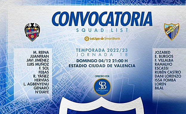 El Málaga viaja con veintiún jugadores para medirse este domingo al Levante, entre ellos los canteranos Bilal, Dani Lorenzo, Issa Fomba y Loren