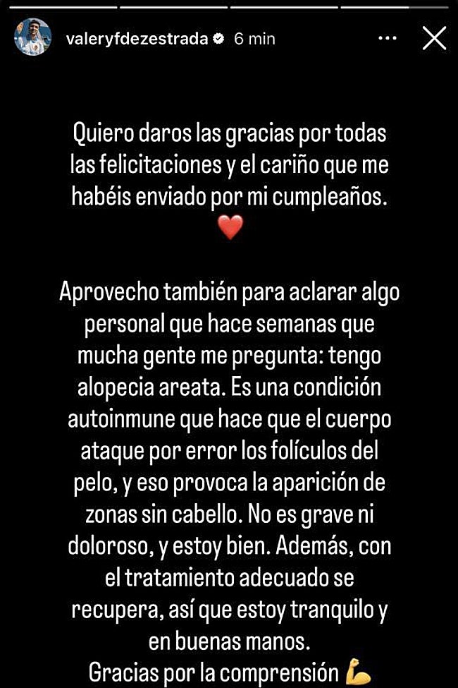 «Aprovecho para aclarar algo personal que hace semanas que mucha gente me pregunta: tengo alopecia areata. No es grave ni doloroso, y estoy bien. Además, con el tratamiento adecuado se recupera, así que estoy tranquilo y en buenas manos. Gracias por la comprensión», explicó para tratar de evitar comentarios infundados y después de que su nueva imagen se haya mostrado de forma muy repentina y haya podido sorprender a todos sus seguidores.