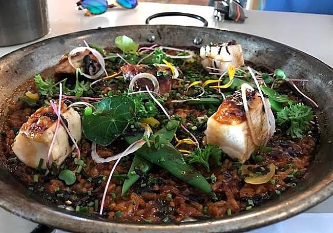Más que un arroz al horno al estilo levantino, es un arroz seco hecho con caldo de ave y verduras que se termina de elaborar en el horno y posteriormente se sirve acompañado de unos tacos de pollo plancheados. Buen fondo y buena ejecución.