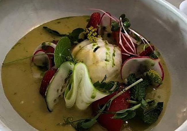 Un plato muy colorista y refrescante, quizá uno de los más mediterráneos de toda la carta. Una buena emulsión de aceite y tomates verdes que se complementan con un helado de burrata.