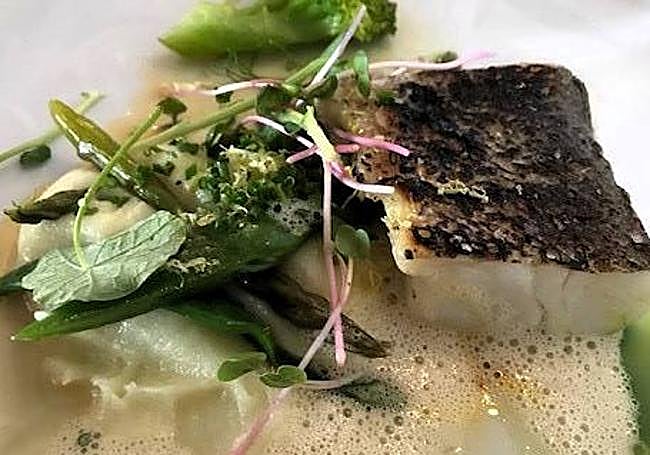 Varias verduras, espárragos verdes, tirabeques y brócoli para acompasar un lomo de merluza que presentaba un exceso de punto, lo que restaba jugosidad a todo el conjunto del plato.