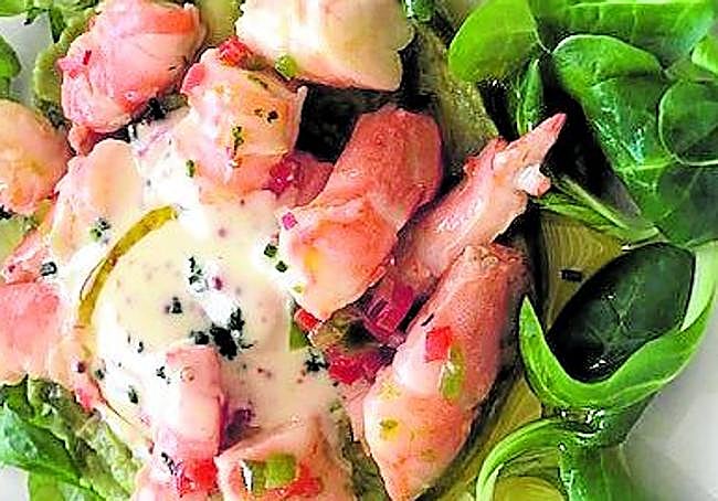 Una suave, casi líquida, mahonesa con mostaza es el hilo conductor de unos langostinos en su punto de cocción que se fusionan con el sabor del aguacate hasta conseguir una ligazón muy refrescante. Platos estival que destaca por su frescor.