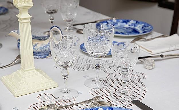 Todas las piezas de las fotografías pertenecen a la colección del Museo del Vidrio y Cristal de Málaga. Esta es la explicación de Fernández-Prieto sobre sus elecciones para la recreación: «Al no ser una cena de gala, se sirve en el comedor de diario. La habitación refleja la mezcolanza internacional que caracteriza a la burguesía malagueña del siglo XIX, muchos con apellidos americanos, ingleses, franceses, holandeses y alemanes. La araña de cristal de La Granja es de finales del siglo XVIII; y la alfombra Carlos IV está firmada por la Real Fábrica de Tapices de Madrid. La mesa, estampillada por Wilkinson and Sons (Londres, 1818), ha sido montada a la manera francesa. Sobre un mantel de lino blanco almidonado, con las servilletas sencillamente dobladas en dos, los cubiertos con el troquel Kings se ordenan al modo de la vieja nobleza de Versalles; con las hojas de los cuchillos mirando al plato y las puntas de los tenedores rozando el mantel como símbolo de no agresividad entre los comensales. Pero al mismo tiempo, con un alarde de riqueza, muestran los punzones de plata de ley fechados en 1832 por el famoso platero londinense George Adams. El cuchillo de mantequilla se posa sobre un objeto de cristal de Val Saint-Lambert, siguiendo la costumbre rusa que se está imponiendo en aquel momento en Europa.