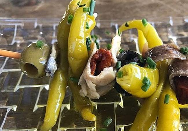 Las gildas, lo mismo que los torreznos, están poniéndose de moda en Málaga, pero no todas son lo mismo. Txema las prepara con unas guindillas en su justo punto de picante y vinagre con unas anchoas de tamaño medio y un boquerón poco hecho.