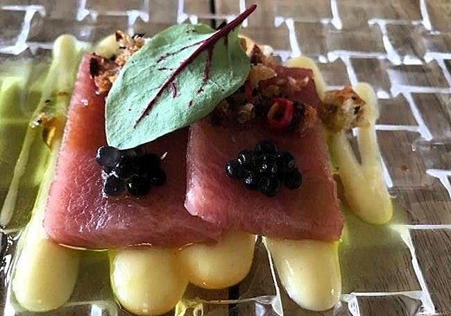 Fusión al máximo entre la ventresca de atún y una salsa de ají amarillo levemente bañada con salmorejo. Las texturas de todos los ingredientes se fusionan en una en cada bocado, donde sobresale el sabor salino. Muy conseguido.