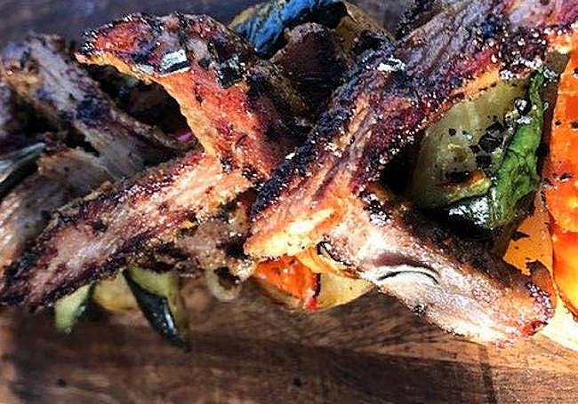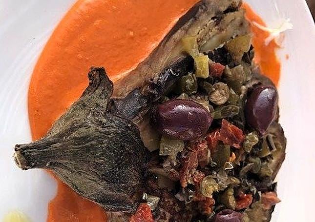 Cuando se domina la parrilla se obtienen verdaderos manjares con productos sencillos. Un ejemplo lo tenemos en estas berenjenas, de tamaño medio, con un ligero toque de tomate seco, alcaparras y piparras que aumentan el sabor del plato.