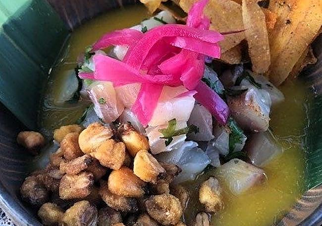 Una elaboración de corte andino muy correcta en cuanto a la utilización del vinagre y los cítricos sobre el pescado junto a un aderezo con base de leche de tigre en ají amarillo y unos chips de plátano macho y choclo. Muy fresco en boca.